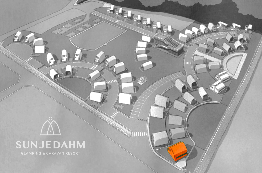 오션뷰글램핑A (패밀리) 타입은 전면 유리 너머로 선재도의 바다가 펼쳐진 공간입니다.
