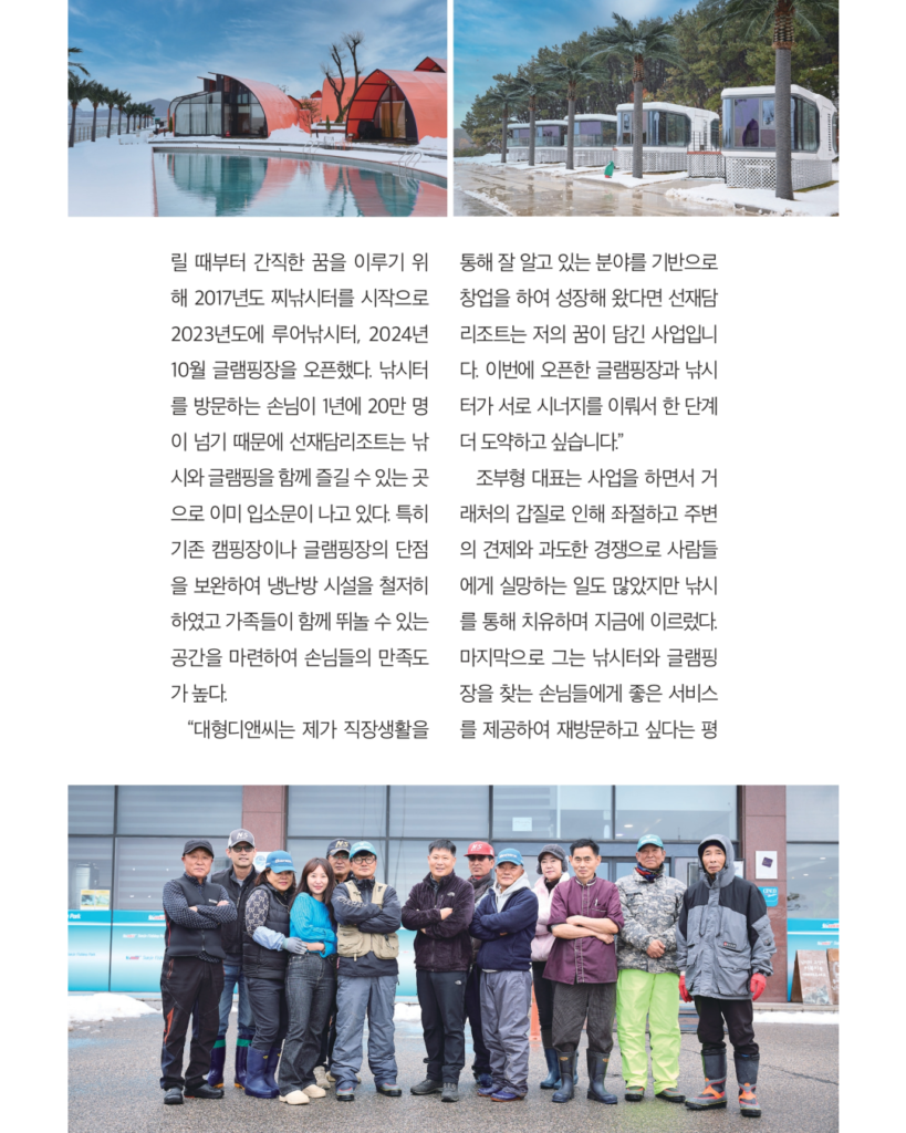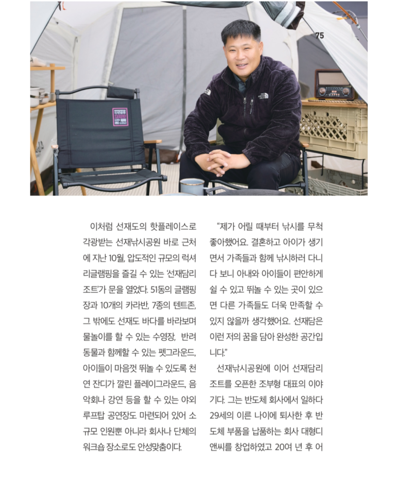 어린 시절부터 낚시에 매료되었던 한 사람은, 가족과 함께한 낚시 여행 속에서 단순히 물고기를 잡는 것을 넘어서 모두가 편안히 머물며 쉴 수 있는 공간에 대한 꿈을 키워나갔습니다. 그 소박한 바람은 어느새 현실의 모습으로 다가와, 선재낚시공원 바로 옆에서 글램핑의 여유와 바다의 풍경을 한데 모은 ‘선재담’으로 탄생하게 되었습니다.